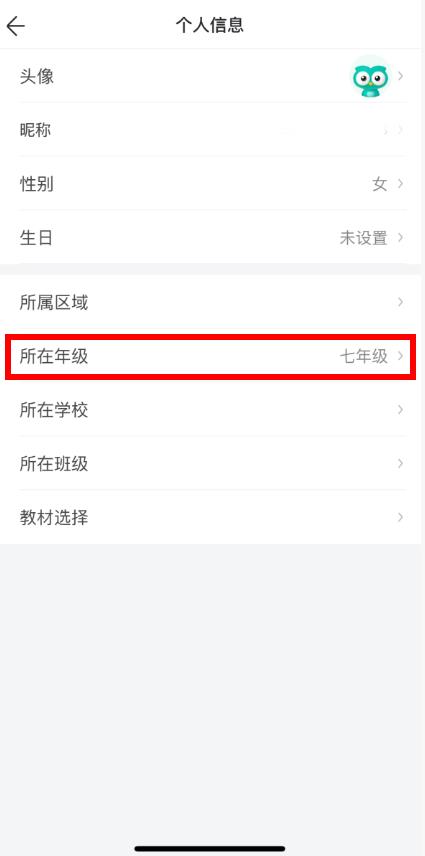 2、在個人信息頁面中,點(diǎn)擊所在年級選項(xiàng)。