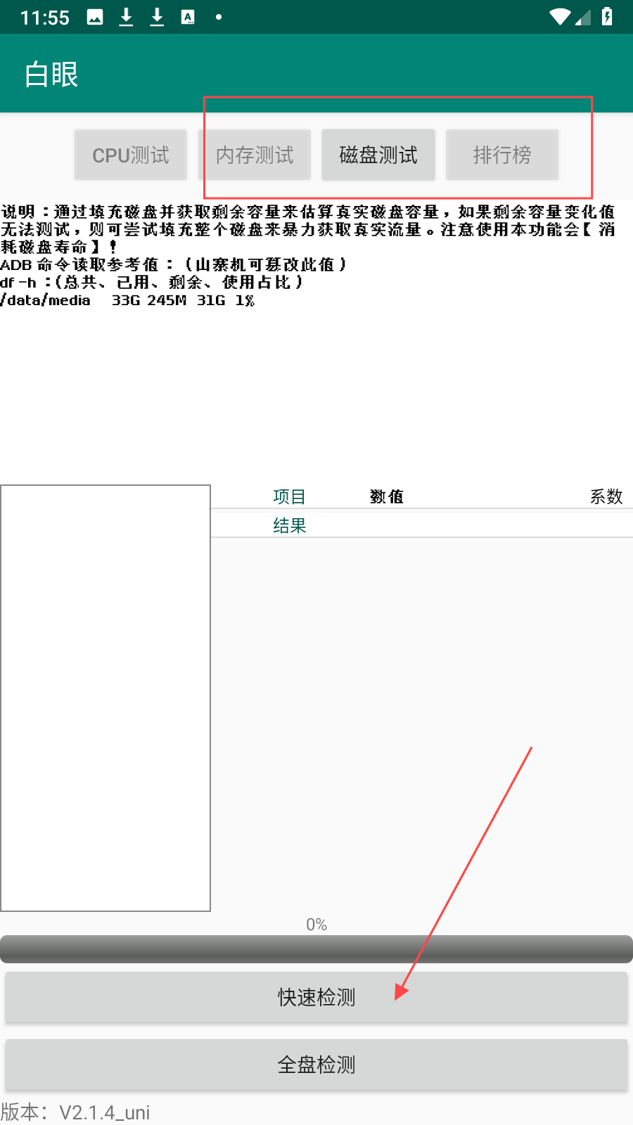 2、如需測(cè)試磁盤(pán),點(diǎn)擊界面中的磁盤(pán)測(cè)試選項(xiàng),,點(diǎn)擊快速檢測(cè)進(jìn)行快速估算,若結(jié)果不準(zhǔn)確,可點(diǎn)擊全盤(pán)檢測(cè)更精確檢測(cè),但耗時(shí)更長(zhǎng)。