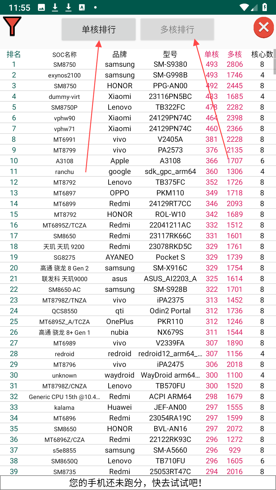 3、查看跑分排行榜,點(diǎn)擊排行榜按鈕,在彈出界面能選擇單核排行或多核排行,查看不同設(shè)備的CPU單核及多核跑分排名情況,了解自己設(shè)備在其中的位置。