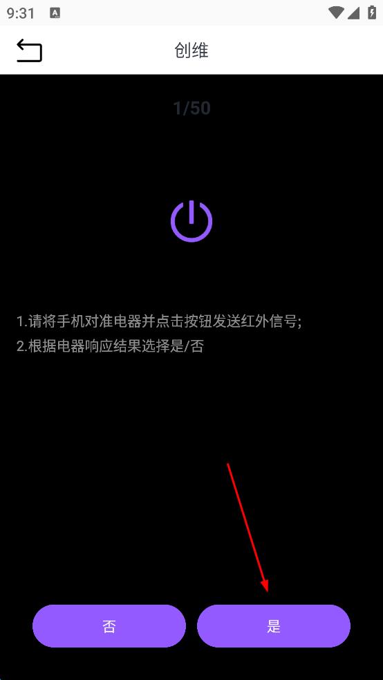 4、將手機(jī)對(duì)準(zhǔn)電器點(diǎn)擊按鈕發(fā)送紅外信號(hào),根據(jù)電器響應(yīng)結(jié)果選擇是或否完成添加。