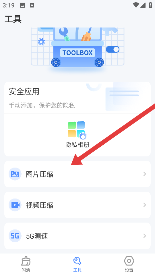 1、打開(kāi)手機(jī)管家,進(jìn)入工具頁(yè)面后,點(diǎn)擊圖片壓縮選項(xiàng),進(jìn)入選擇圖片界面。
