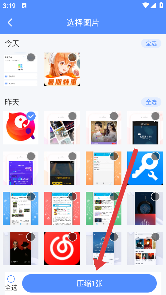 2、在選擇圖片的頁(yè)面中,勾選需要壓縮的圖片如昨天欄目下的紅色圖標(biāo)圖片。