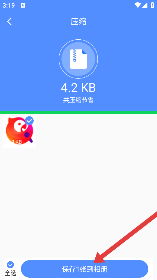 3、勾選完成后,點(diǎn)擊底部的壓縮1張按鈕,進(jìn)入壓縮進(jìn)度頁(yè)面,壓縮完成后,點(diǎn)擊保存1張到相冊(cè)按鈕。