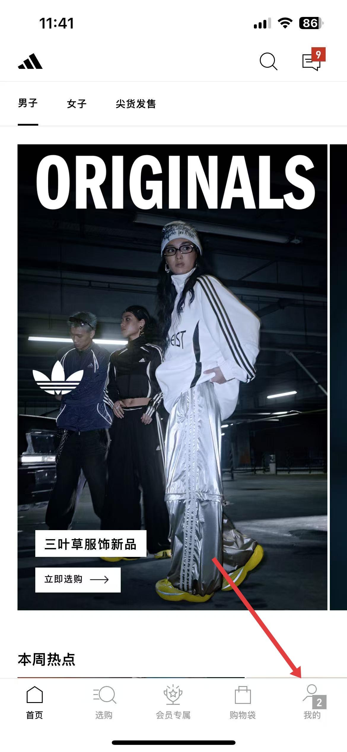 1、打開阿迪達(dá)斯app進(jìn)入首頁后,點(diǎn)擊底部導(dǎo)航欄最右側(cè)的我的圖標(biāo)進(jìn)入個人相關(guān)界面。