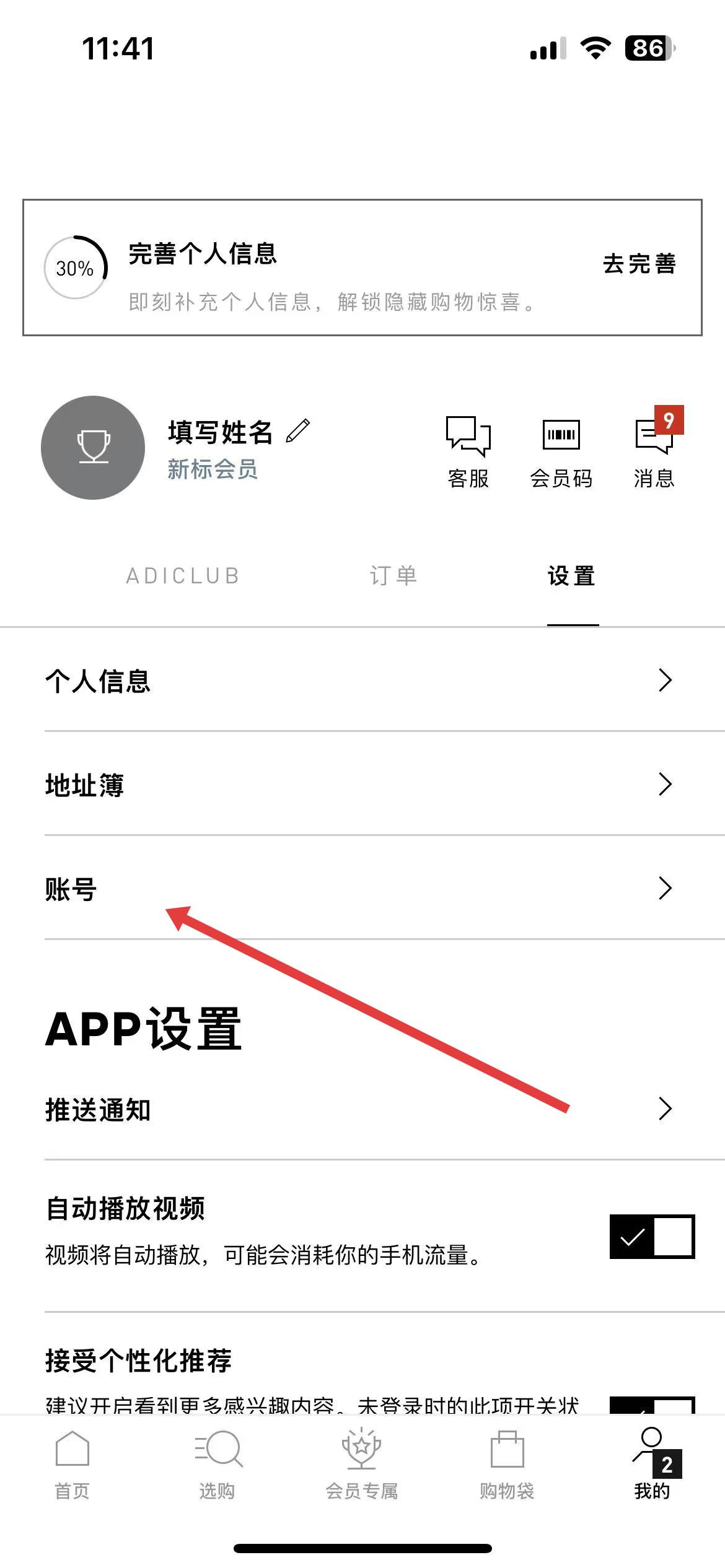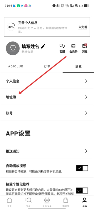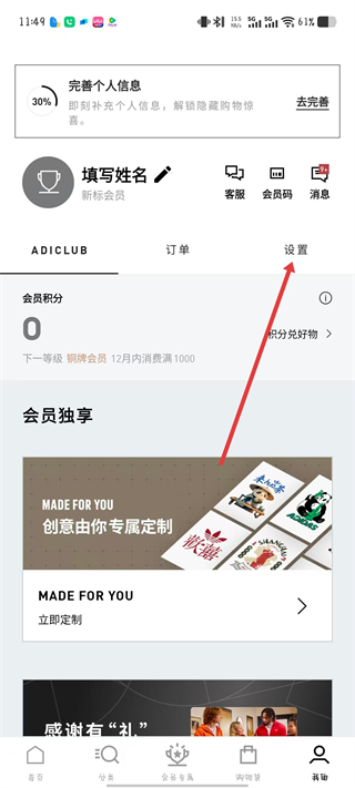 1、打開阿迪達(dá)斯APP,進(jìn)入個人頁面后點(diǎn)擊設(shè)置選項。