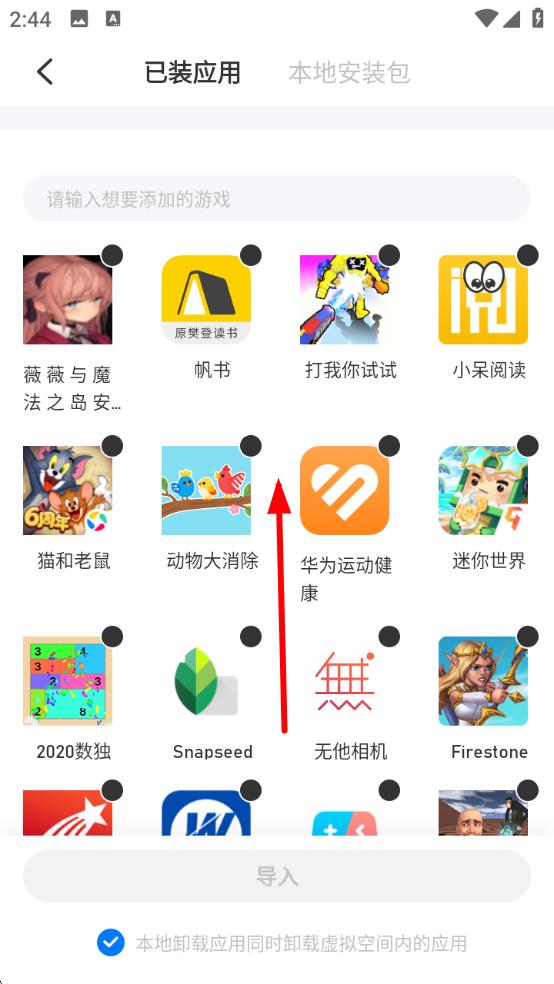 3、在應用列表中勾選要添加的游戲點擊導入完成后點擊游戲圖標即可在虛擬空間運行。