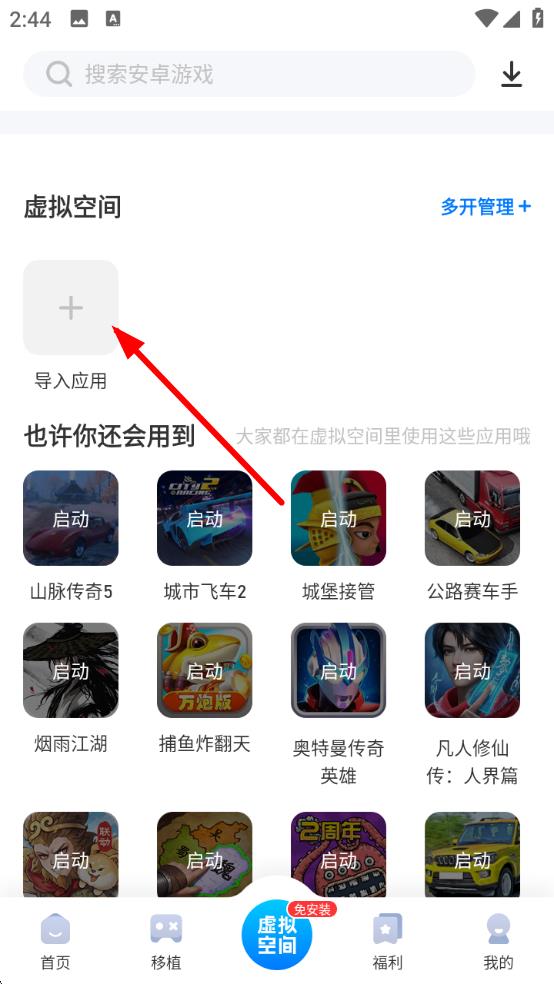 2、在虛擬空間界面點擊加號圖標選擇導入應用功能進入應用選擇頁面。