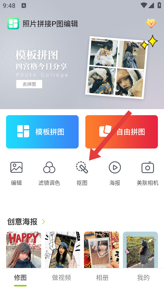 1、在照片拼接P圖編輯的首頁(yè),需要點(diǎn)擊摳圖選項(xiàng),進(jìn)入圖片選擇界面。