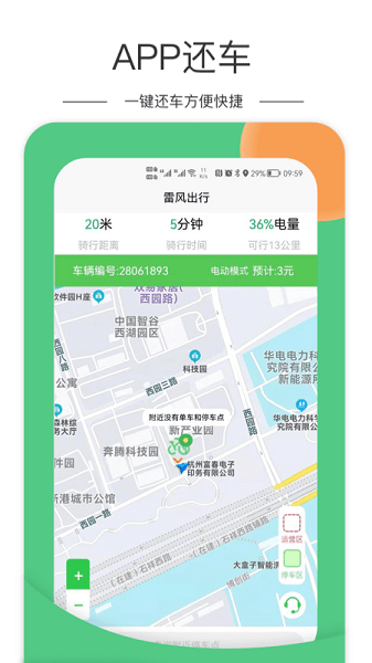 電子圍欄內(nèi)手機一鍵還車,非電子圍欄內(nèi)提供“臨時停車”功能,支持遠程鎖車。