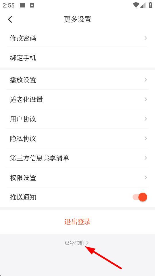 3、在更多設(shè)置頁面,下滑找到并點(diǎn)擊賬號注銷選項(xiàng)。