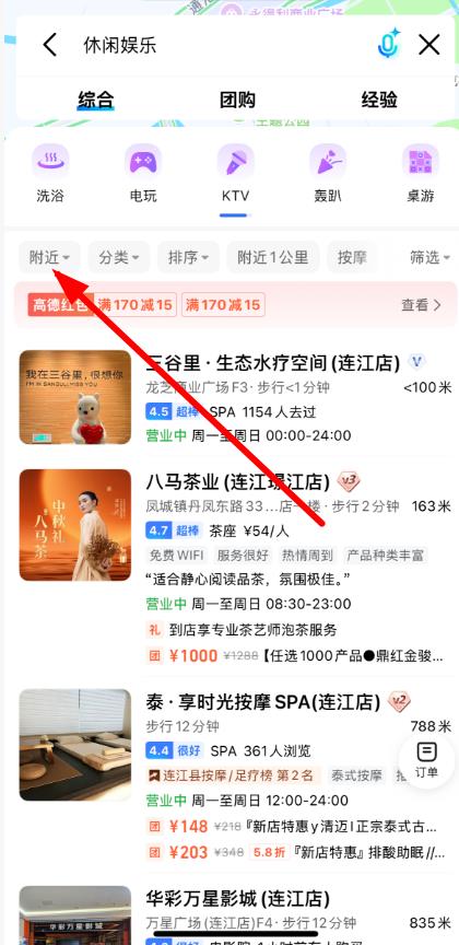 3、進(jìn)入后默認(rèn)展示周邊相關(guān)美食或酒店信息,可點(diǎn)擊附近選項(xiàng)設(shè)置搜索范圍,篩選符合需求的美食或酒店。