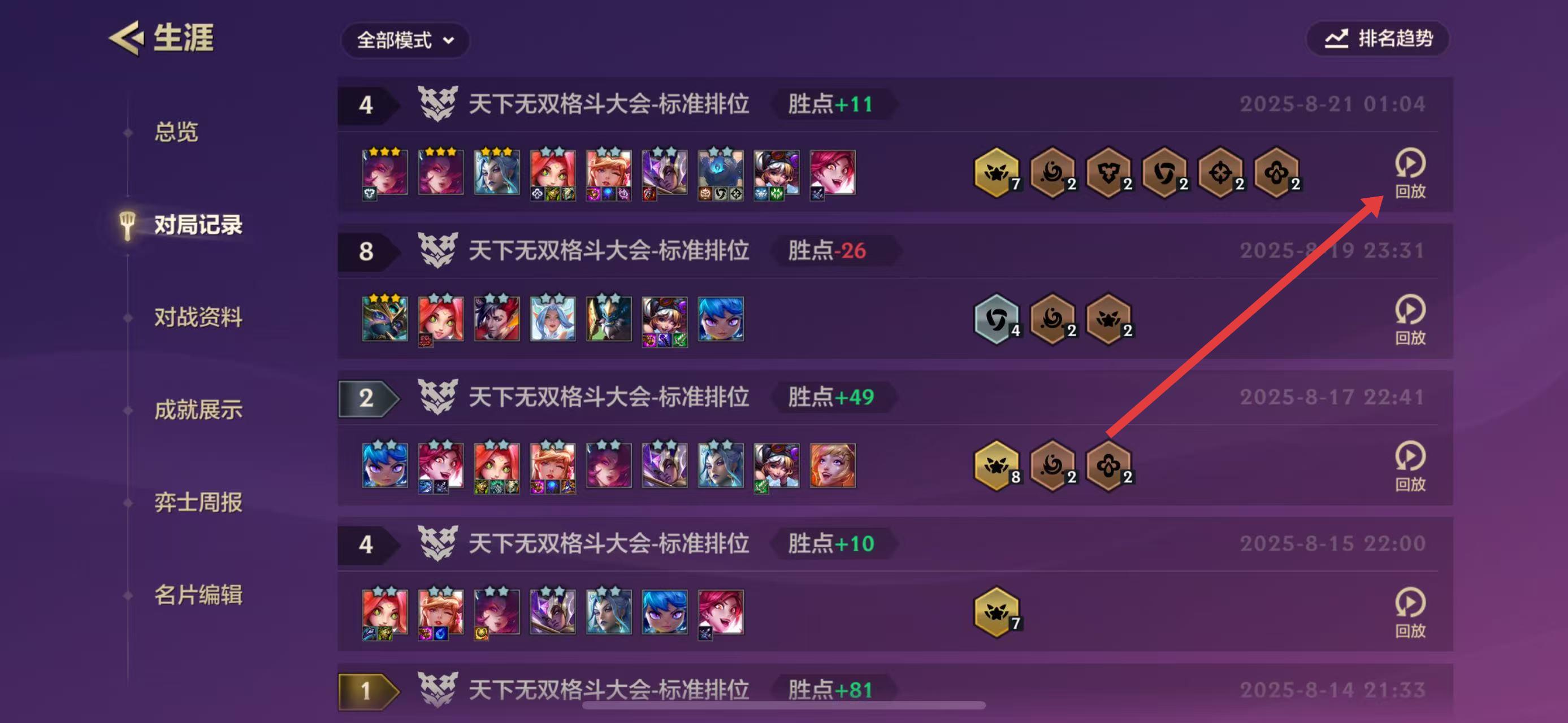 3、進(jìn)入對(duì)局記錄頁面后,能看到歷史對(duì)局信息,在想要查看回放的對(duì)局右側(cè),點(diǎn)擊回放按鈕,即可觀看該場(chǎng)游戲的回放。