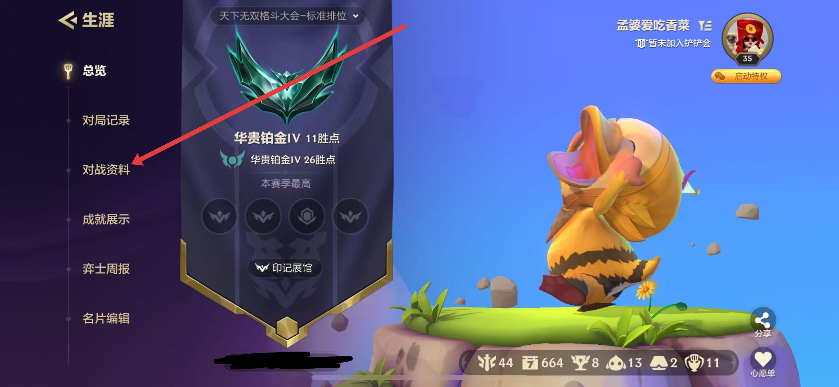 1、打開金鏟鏟之戰(zhàn)游戲,進(jìn)入主界面,點(diǎn)擊左下角的個(gè)人頭像,進(jìn)入生涯界面。
