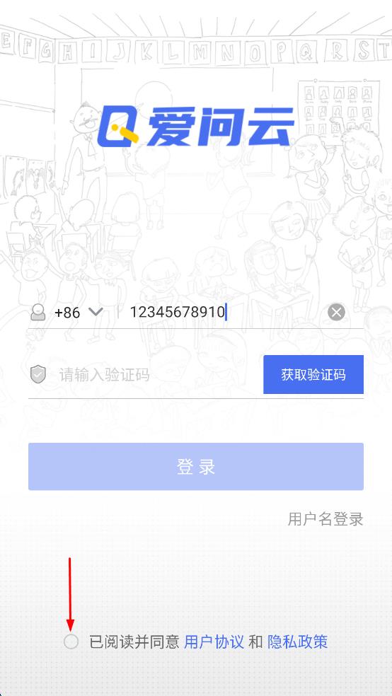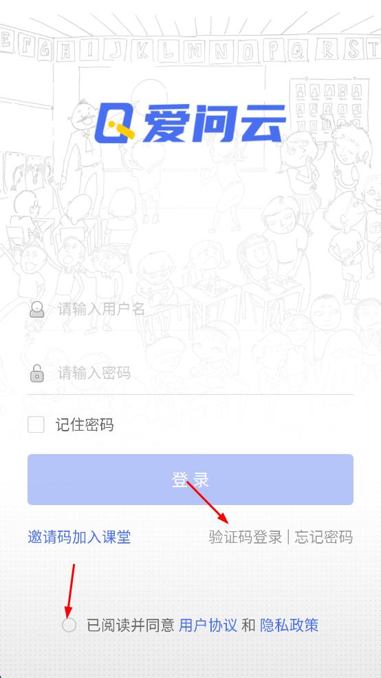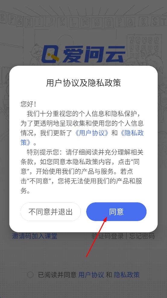 1、打開愛問云APP,在彈出的用戶協(xié)議及隱私政策頁面,點擊“同意”,進入登錄界面后,點擊“驗證碼登錄”,再勾選“已閱讀并同意用戶協(xié)議和隱私政策”。