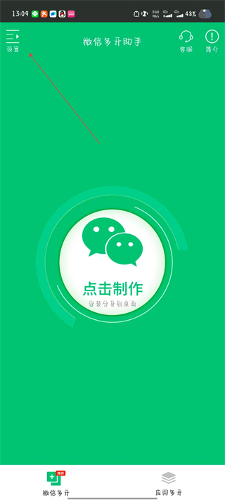 1、打開微信多開助手應(yīng)用,點擊左上角的設(shè)置按鈕。