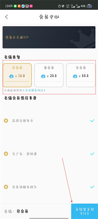 3、進(jìn)入會員中心頁面,選擇想要購買的會員類型并點擊支付。