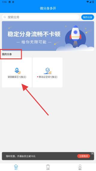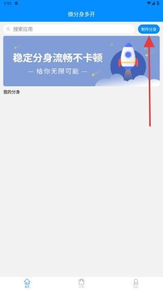 1、打開(kāi)微分身多開(kāi)APP,進(jìn)入到首頁(yè)內(nèi),點(diǎn)擊制作分身的功能按鈕。