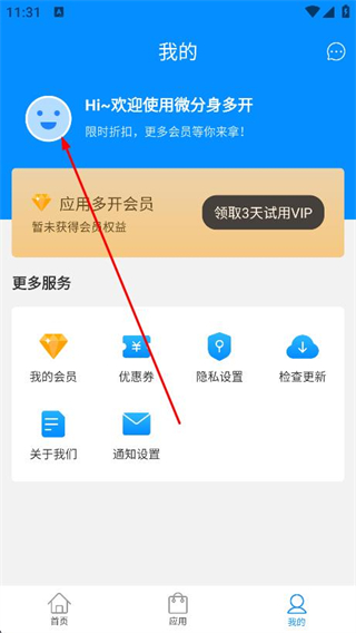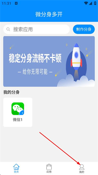 1、打開(kāi)微分身多開(kāi)APP,點(diǎn)擊底部導(dǎo)航欄右側(cè)我的選項(xiàng)。