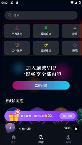 4、可選擇學習效率、緩解焦慮、睡眠等分類,進而使用對應(yīng)腦波內(nèi)容。