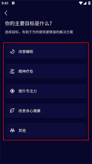 2、在目標選擇頁面,選擇如改善睡眠、提升專注力等其中一個主要目標。