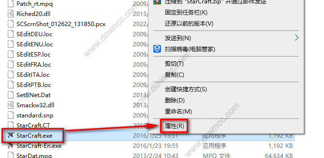 ①進(jìn)入文件夾“StarCraft”找到文件“StarCraft.exe”。鼠標(biāo)右鍵點(diǎn)擊“StarCraft.exe”→“屬性”