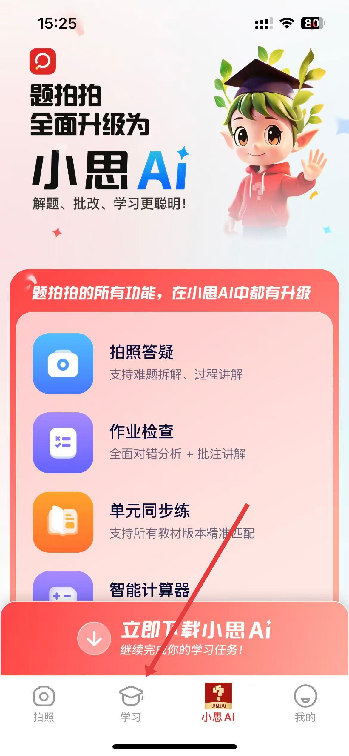 1、打開題拍拍app,點擊底部導(dǎo)航欄中的學(xué)習(xí)選項,進入學(xué)習(xí)功能頁面。