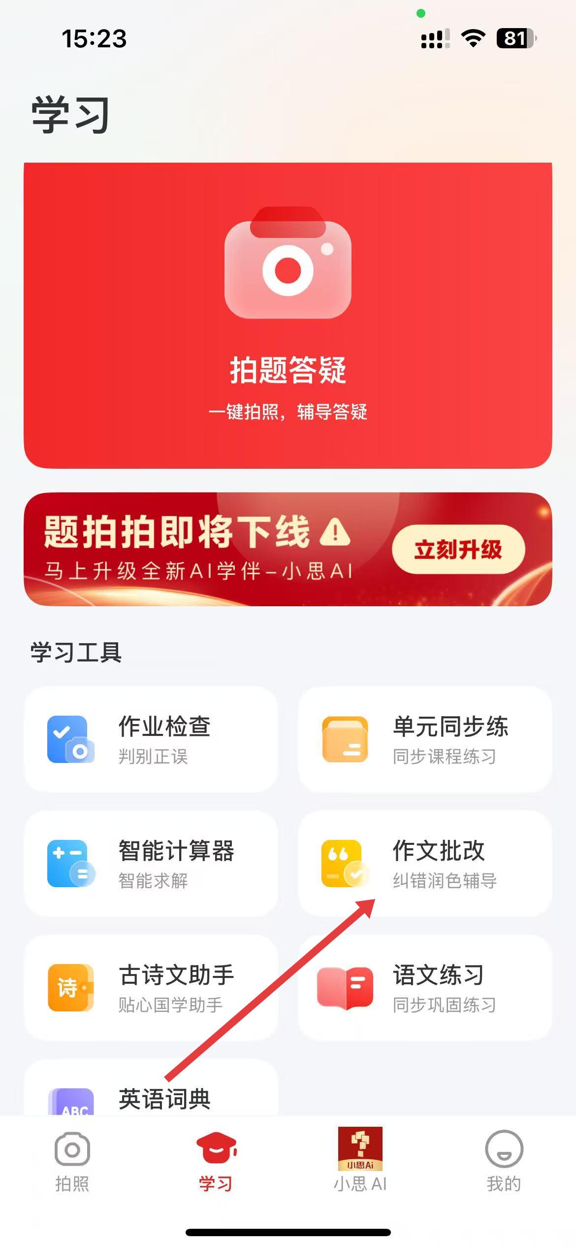2、在學(xué)習(xí)工具列表里,點擊作文批改選項,進入作文批改頁面。