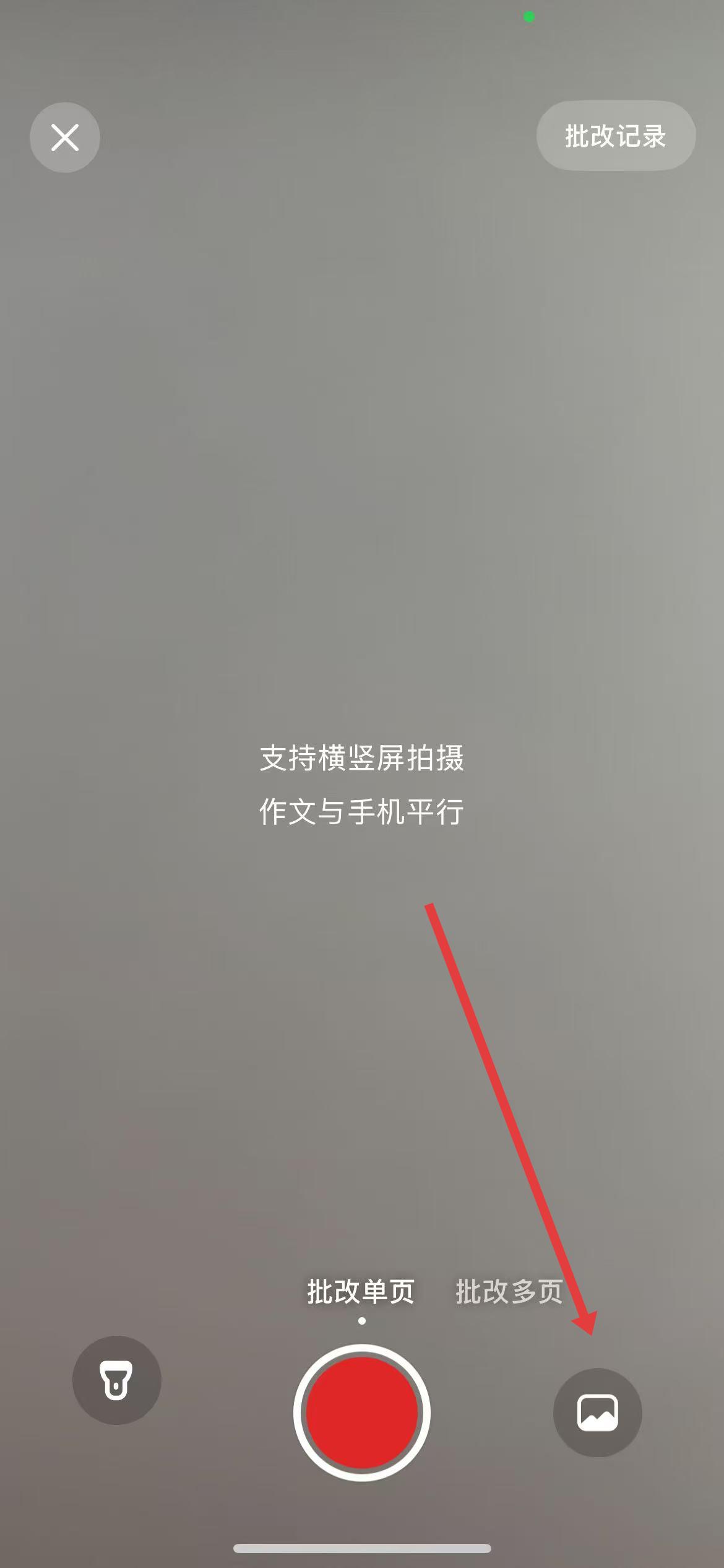 3、進入批改界面后,若要拍攝作業(yè),點擊下方紅色拍攝按鈕,若要上傳已拍好的作業(yè)圖片,點擊拍攝按鈕右側(cè)的圖片圖標(biāo),選擇手機相冊中的作業(yè)圖片。