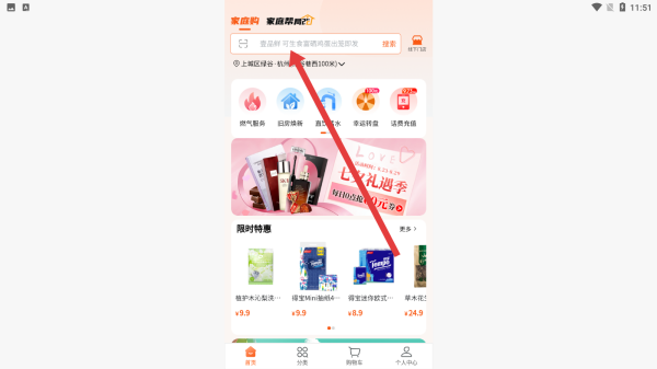 1、點擊壹品慧首頁頂部搜索框,準備輸入關鍵詞,開啟使用搜索商品流程。