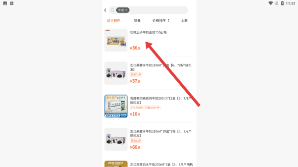 3、查看搜索結果頁的商品列表,瀏覽牛奶等商品的價格與詳情,點擊購買心儀商品。