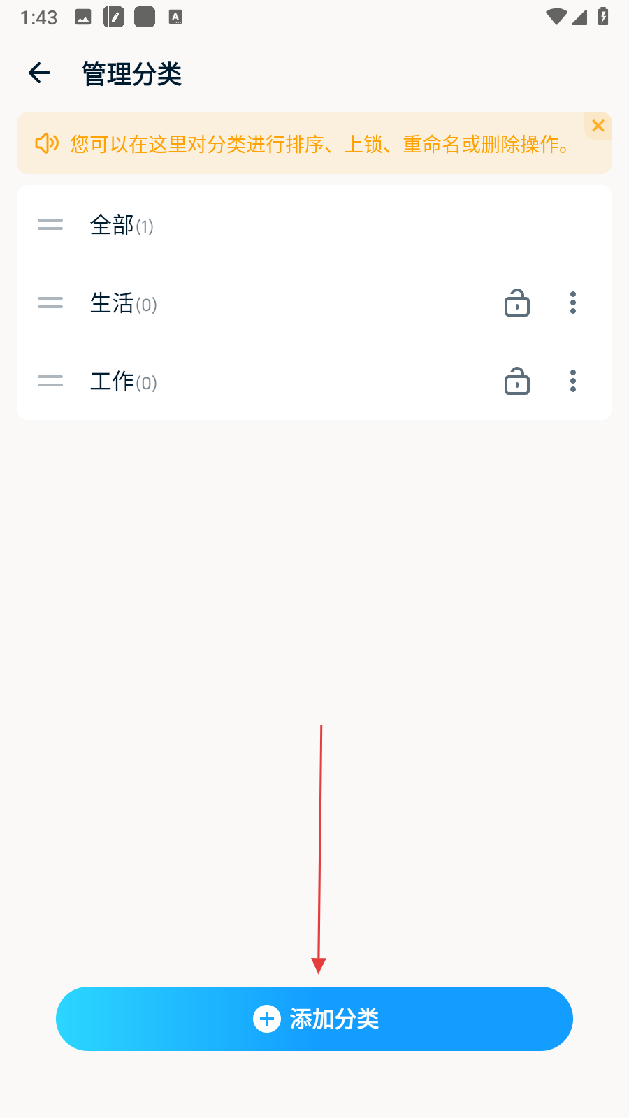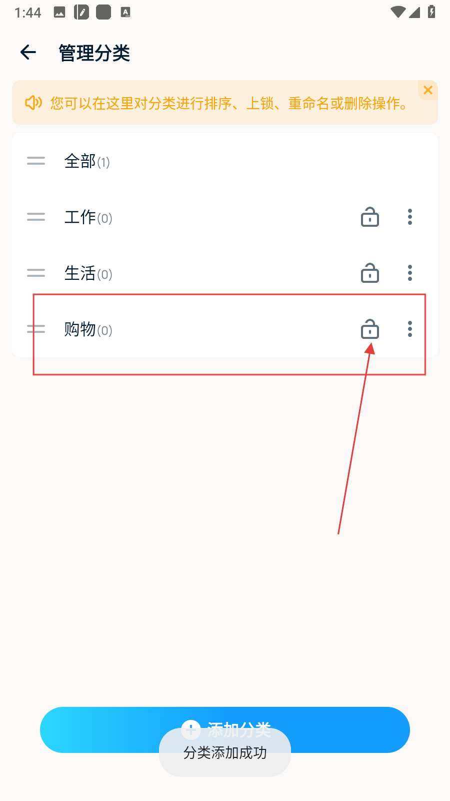 4、添加完成后,在管理分類頁面能看到新增的分類,還可點擊分類旁的鎖形圖標(biāo),對該分類進行上鎖等進一步設(shè)置。