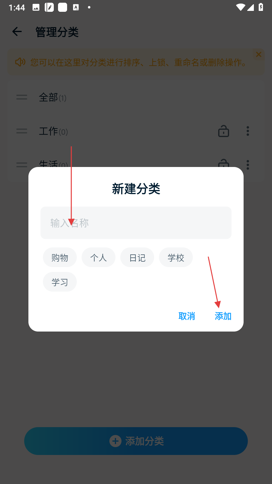 3、在新建分類窗口中,可直接輸入自定義的分類名稱,也可選擇預(yù)設(shè)的分類標(biāo)簽,選好后點擊添加按鈕。