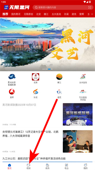1、打開無限黑河APP,點擊底部導(dǎo)航欄中的視頻選項,進入視頻頁面。