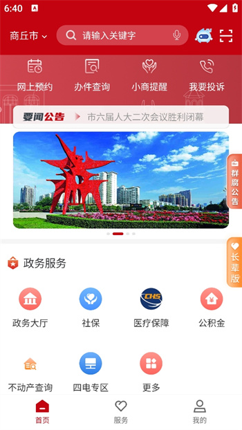 1、來到應用中首先你會看到一系列分布的當?shù)胤?,這里匯聚著政務服務、公告服務、社會服務還有特色專區(qū)服務等等一系列的網(wǎng)上便捷功能;