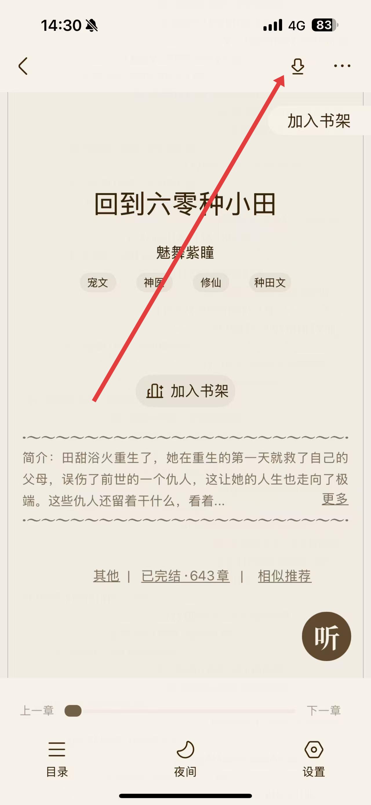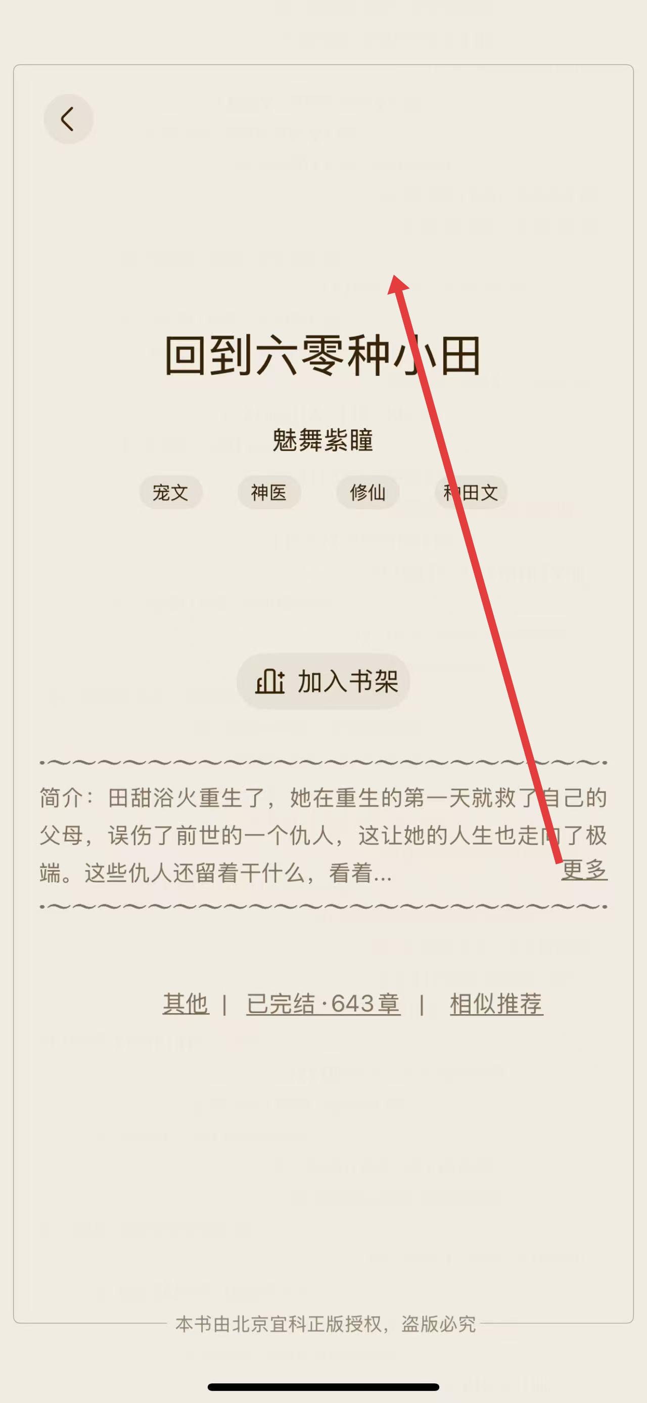 1、打開(kāi)閱讀回到六零種小田的界面,進(jìn)入書(shū)籍詳情頁(yè)。