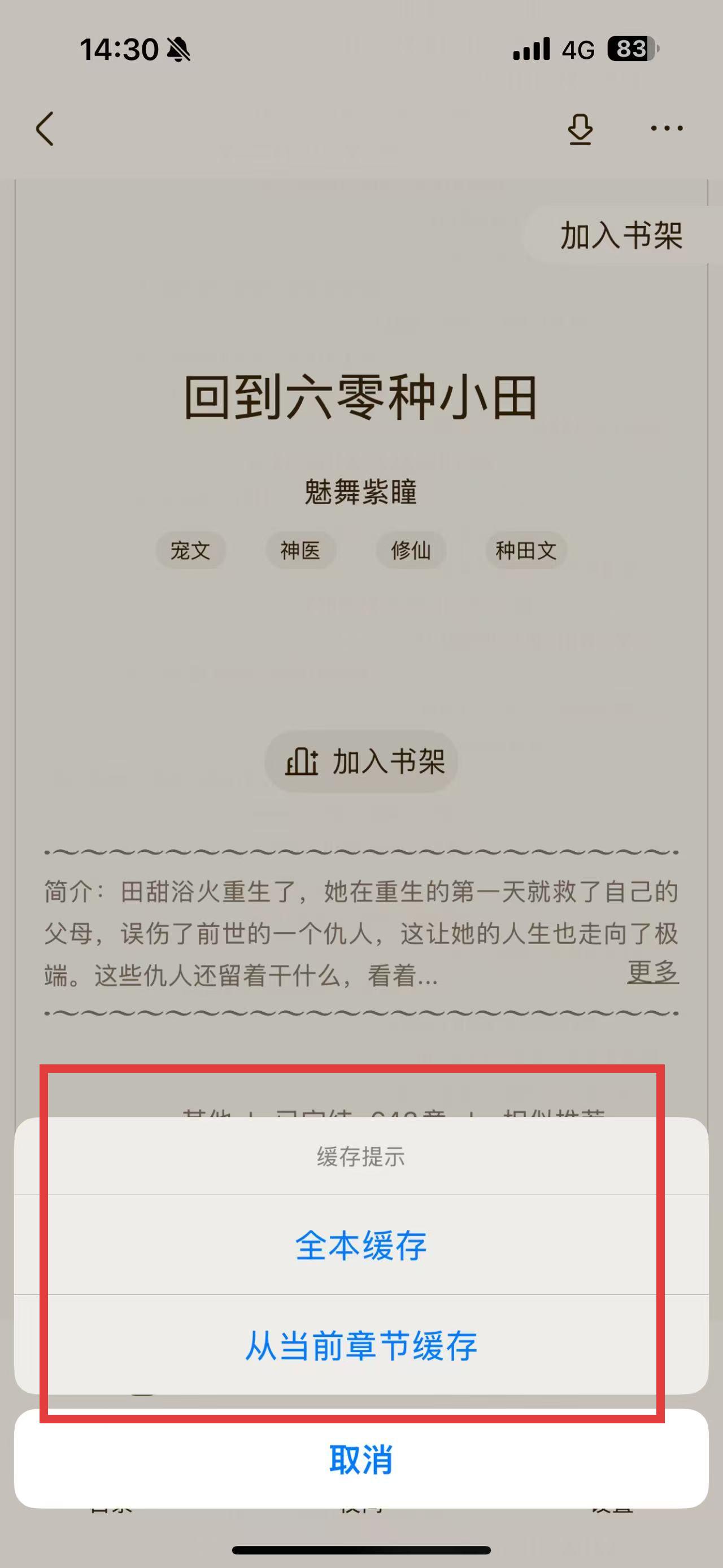 3、在彈出的緩存提示中,選擇全本緩存或從當(dāng)前章節(jié)緩存,即可緩存小說(shuō)內(nèi)容。