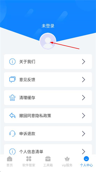 2、在個(gè)人中心頁面,點(diǎn)擊未登錄頭像,進(jìn)入登錄頁面。