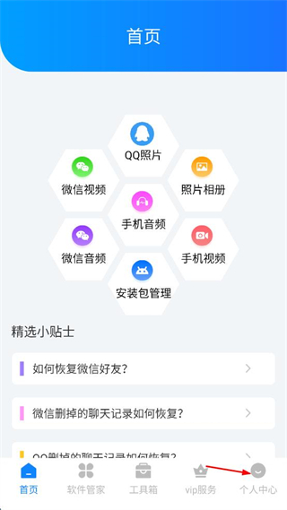 1、打開數(shù)據(jù)管理軟件,點(diǎn)擊右下角個(gè)人中心。