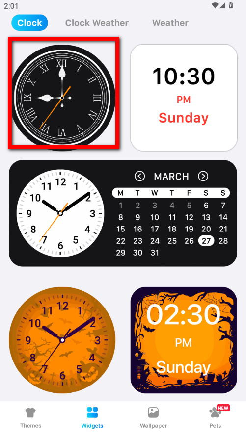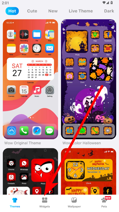 2、在主題界面中,點(diǎn)擊底部的Widgets小部件選項(xiàng),瀏覽各類小組件。