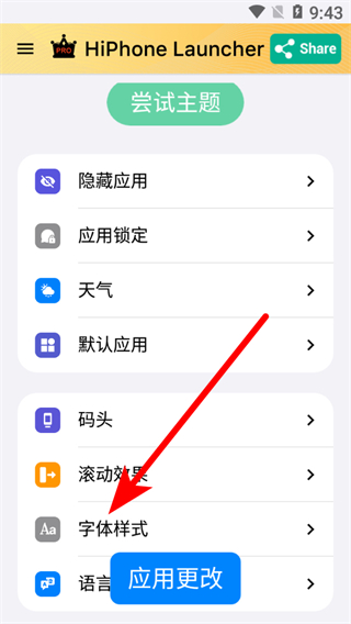 1、在HiPhone Launcher設(shè)置頁(yè)面,點(diǎn)擊字體樣式選項(xiàng),進(jìn)入字體選擇頁(yè)面。