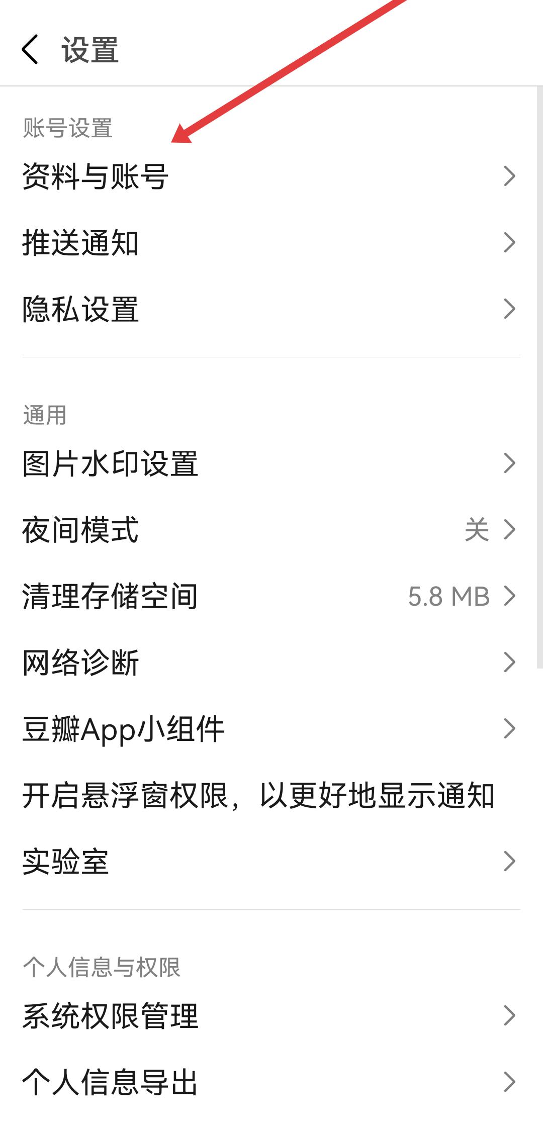1、打開豆瓣APP,進(jìn)入個(gè)人的設(shè)置頁面后,需要點(diǎn)擊資料與賬號(hào)選項(xiàng),進(jìn)入資料與賬號(hào)的設(shè)置界面。