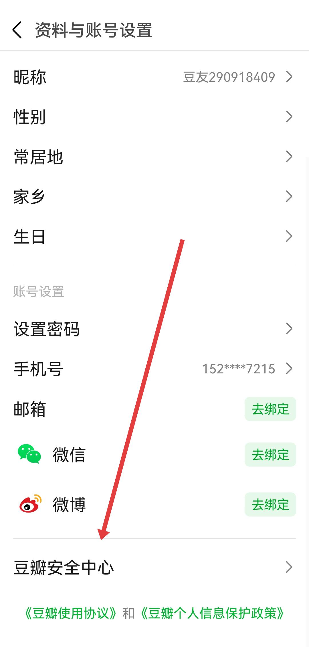 2、在資料與賬號(hào)設(shè)置頁面中,滑動(dòng)至底部找到豆瓣安全中心選項(xiàng)并點(diǎn)擊,進(jìn)入安全中心的頁面。
