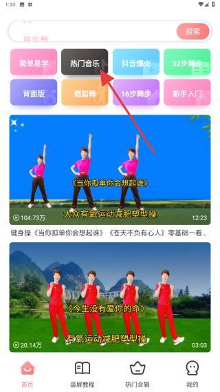 1、打開(kāi)廣場(chǎng)舞大全APP,在首頁(yè)內(nèi)點(diǎn)擊熱門(mén)音樂(lè)的標(biāo)簽。