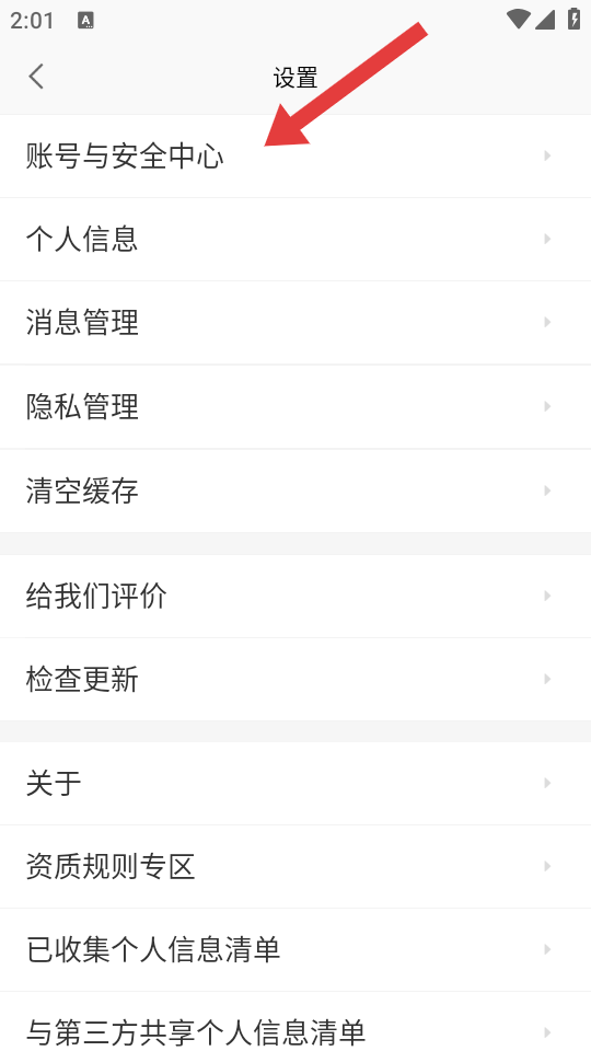 2、進(jìn)入設(shè)置頁面后,點(diǎn)擊賬號與安全中心選項(xiàng)。