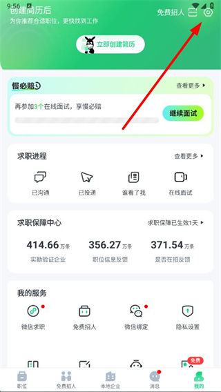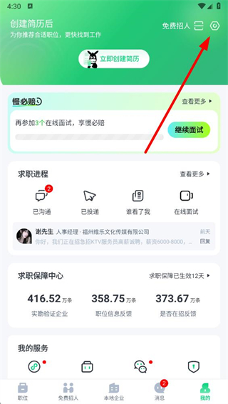 1、打開趕集招聘APP,在我的頁面點(diǎn)擊右上角設(shè)置圖標(biāo)。