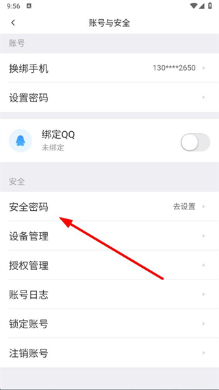4、在賬號與安全頁面點(diǎn)擊安全密碼選項(xiàng),按提示完成安全密碼設(shè)置。