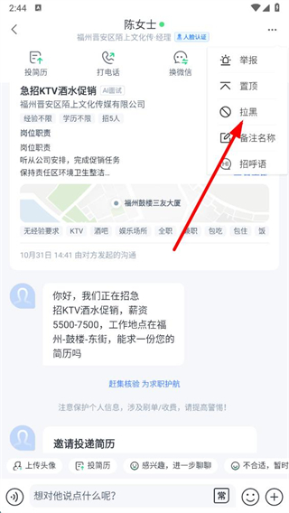 4、在彈出的菜單中,點(diǎn)擊拉黑選項(xiàng)即可拉黑人。