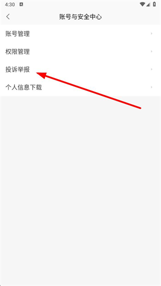 3、在賬號與安全中心頁面,點(diǎn)擊投訴舉報(bào)選項(xiàng)。