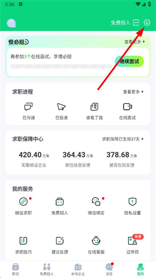 1、在趕集招聘app個(gè)人頁面點(diǎn)擊右上角設(shè)置圖標(biāo),進(jìn)入設(shè)置頁面。