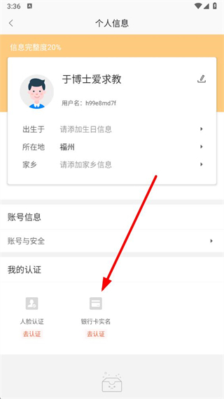 3、在個(gè)人信息界面的我的認(rèn)證板塊,點(diǎn)擊銀行卡實(shí)名去認(rèn)證按鈕。